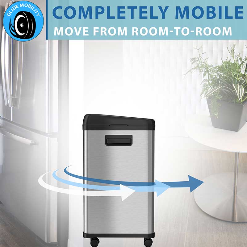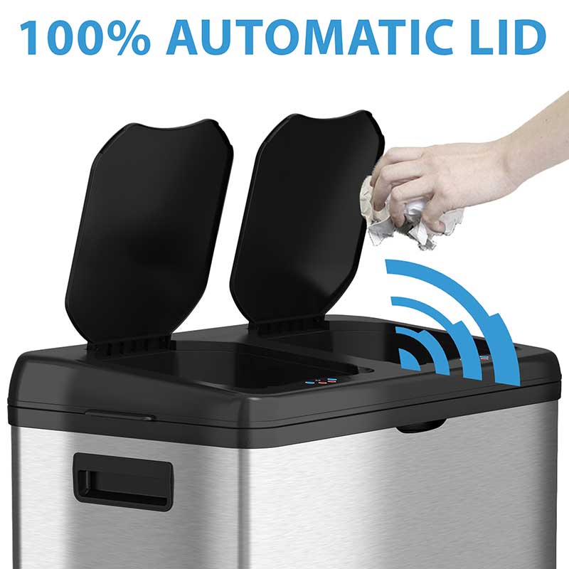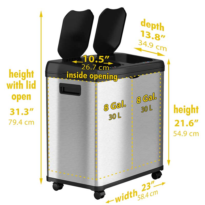The easiest way to separate trash and recyclables. The dual-compartment receptacle has two 8 gallon bins with independent sensor lids to throw away waste and recyclable items. The brushed stainless steel can body finish is smudge-resistant, easy to clean, and complements any decor. The ABS plastic top is durable and attractive.