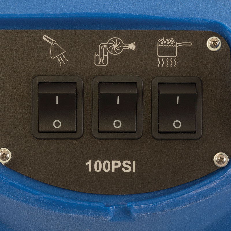 Recessed electronic switch plate protects switches from solution tank and reduces water exposure. | Two front panel roller wheels assist in loading and unloading from a transport vehicle. | Molded wand caddy fro easy transport. |
