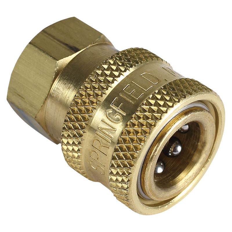 1/4 In. FNPT brass socket quick coupler. Ideal for quick exchange of spray nozzles and spray guns. Knurling on the socket sleeve allows for easy use. Ball lock design insures a solid connection every time. 5500 psi. Cold water only.