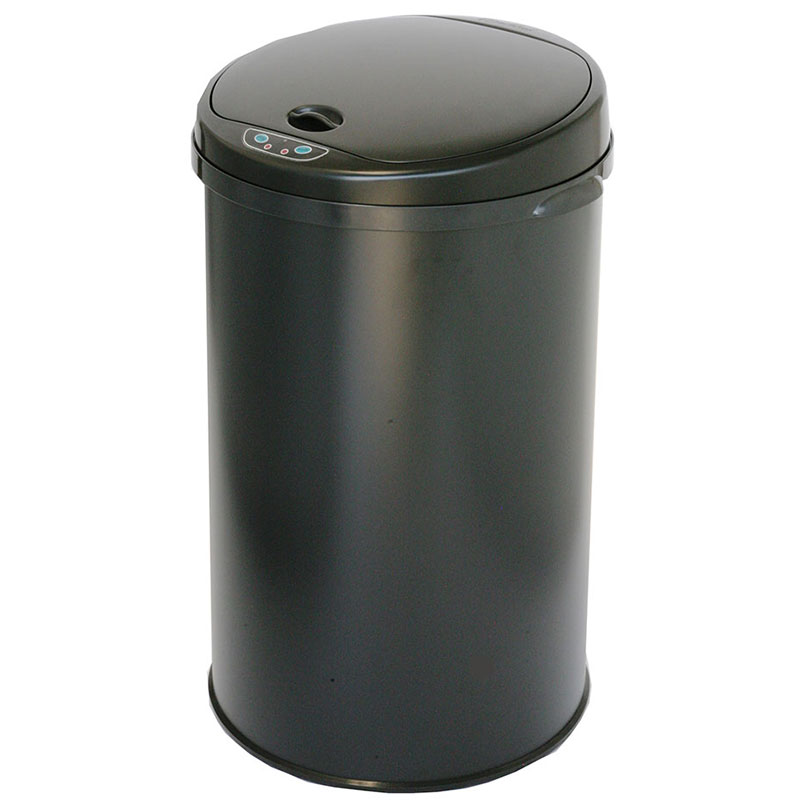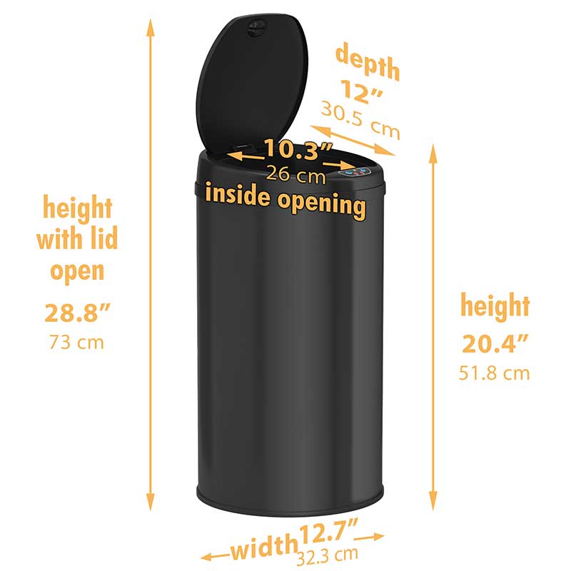Round sensor-activated trash can eliminates exposure to the illness-causing bacteria that live on trash can surfaces. This round touch-free trash can has a 10" opening that easily accommodates large and bulky items in high-traffic areas. The automatic trash can also o features an enhanced lid hinge mechanism, air vent holes for effortless trash bag removal, and carry handle for easy mobility.