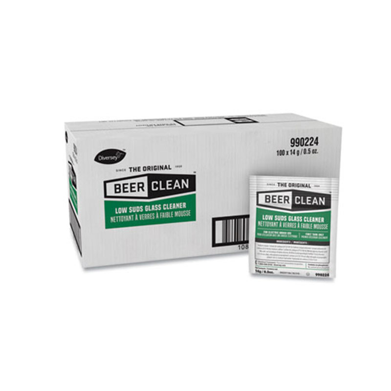 For sparkling clean glassware and better tasting beer. Powdered compound cleans in hot, cold, hard or soft water. Two formulas: 1/2-oz. pouch. 100 pouches per case. Low Suds Cleaner.