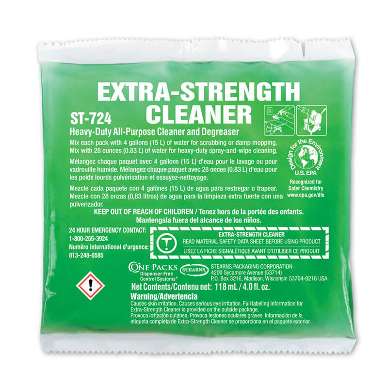 Unlike harsh caustics and volatile solvents, Extra-Strength Cleaner cleans safely without hazardous fumes and toxic byproducts. It is ideal for use in food service areas, garages, and machine shops.