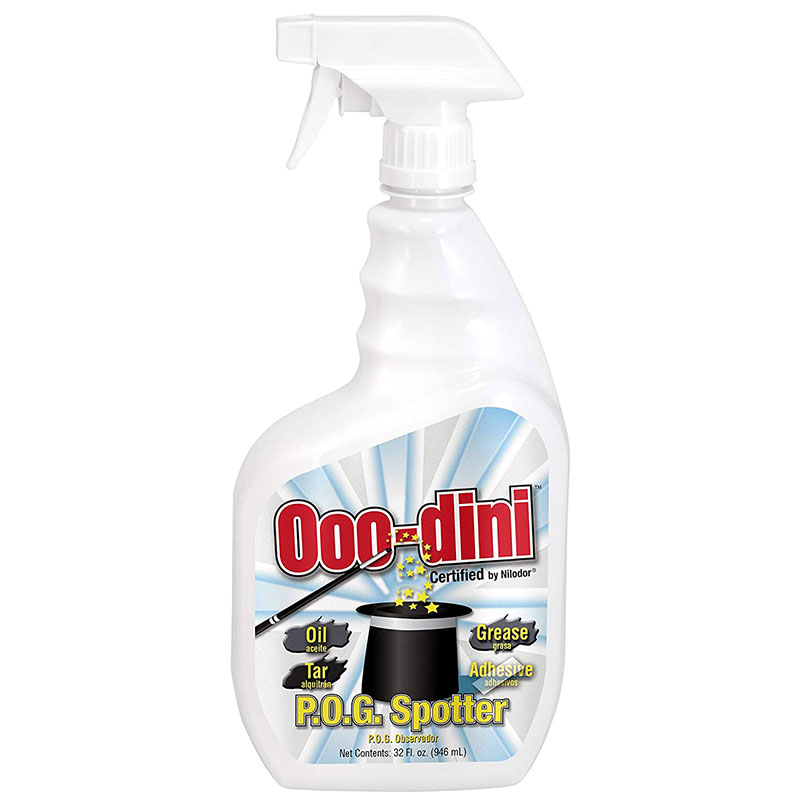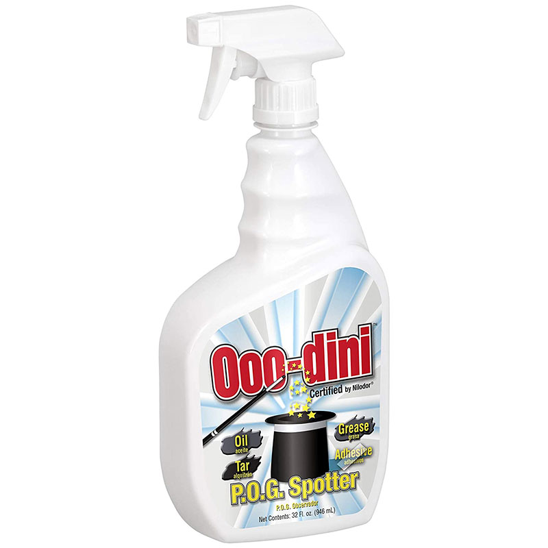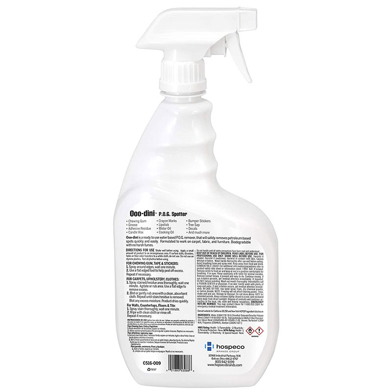 Ooo-dini is a ready to use water-based goo and adhesive remover. Safely removes petroleum-based spots quickly and easily. Formulated to work on carpet, fabric and furniture. Non-toxic and biodegradable, with no harsh fumes.