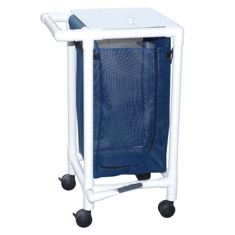 A single laundry hamper features a 14.46 gallon mesh bag and foot pedal for easy access. MJM's PVC frame laundry hampers are the standard for any healthcare environment. The PVC frame and mesh bag inhibit the growth of bacteria. The front zipper opening allows for easy removal of laundry, eliminating lifting heavy loads. The wire frame at the base helps support the mesh bag or liner, while the hamper is reinforced at all stress related areas.