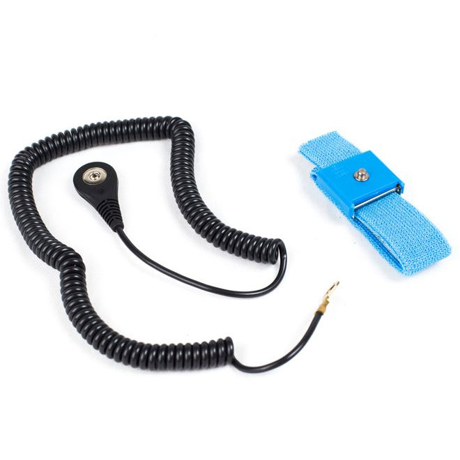 Static strap is secured to the handle of the upright and discharges static electricity that could build up in the environment.