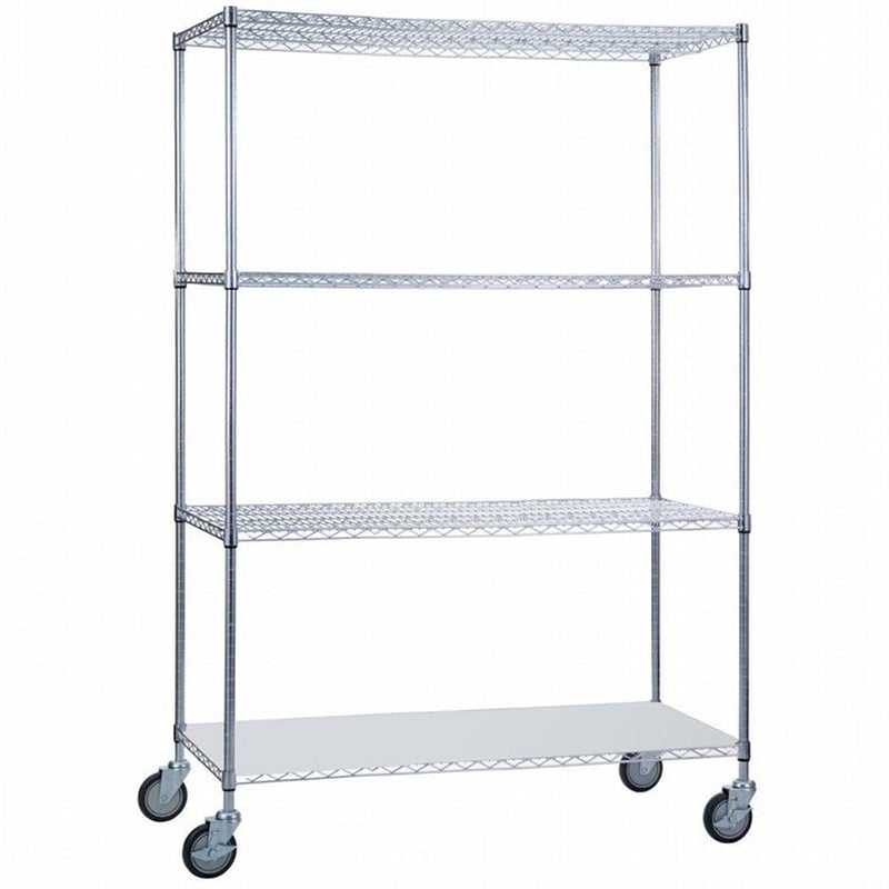 - Three sturdy 18" x 48" wire shelves and one solid bottom shelf with a powder coated finish