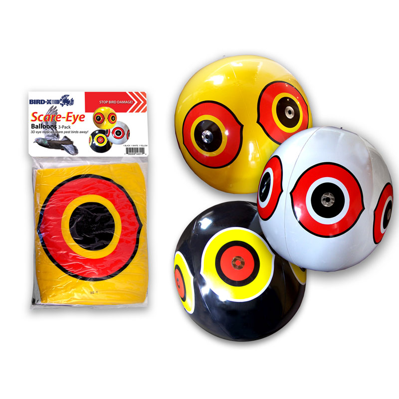 The Scare-Eye ballons help keep birds away with simple vinyl ball visual deterrents that move with the wind and intimidate pesty birds within visible range. The set includes three Scare-eye ballons in: yellow, white, and black colors. It is an easy to use, cost-effectigve solution and can be installed anywhere.