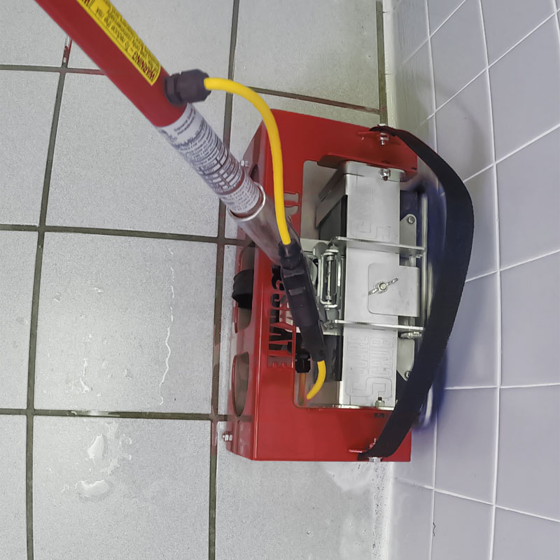 - Turns sideways to scrub baseboards, tile & grout, and stairs at 90 degrees