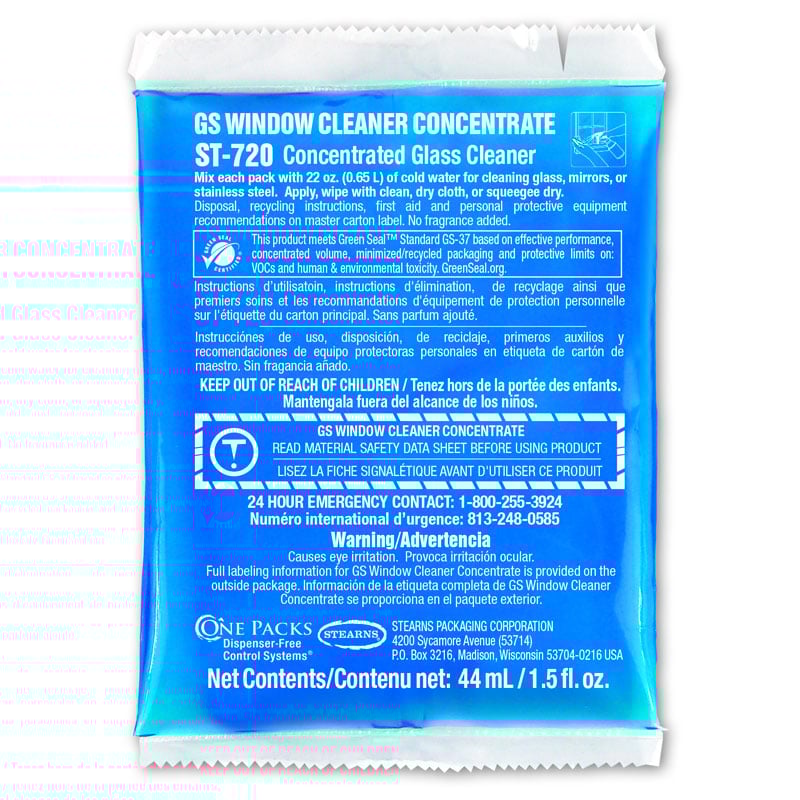 Packaged in source-reduced plastic packs, GS Window Cleaner COncentrate is formulated to meet published standards of environmentally preferable industrial and institutional cleaners. These standards require low levels of human and aquatic toxicity, high levels of biodegradability and performance and reduced smog production potential.