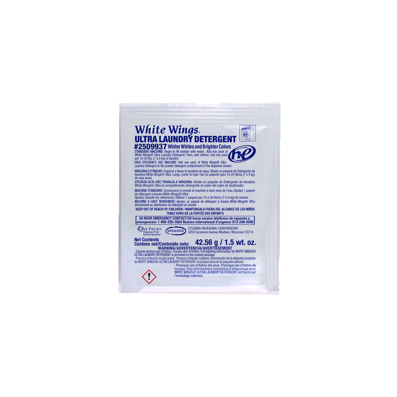 White Wings® Ultra Laundry Detergent is a low-foaming balanced blend of ingredients, assuring brighter, cleaner clothes. Designed for laundry use in institutions and home automatic washing equipment. Easily rinses from fabrics. Contains no lye or strong caustic components.