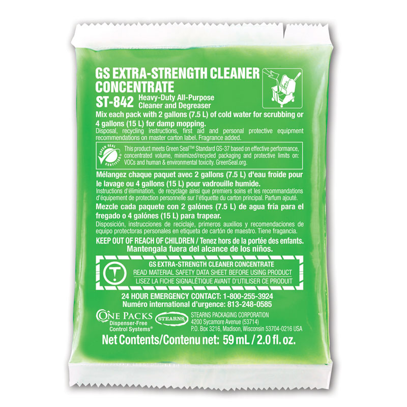 Packaged in recyclable plastic packs, GS Extra-Strength Cleaner Concentrate is formulated to meet published standards of environmentally preferable industrial and institutional cleaners. These standards require low levels of human and aquatic toxicity, high levels of biodegradability and performance, and reduced smog production potential.
