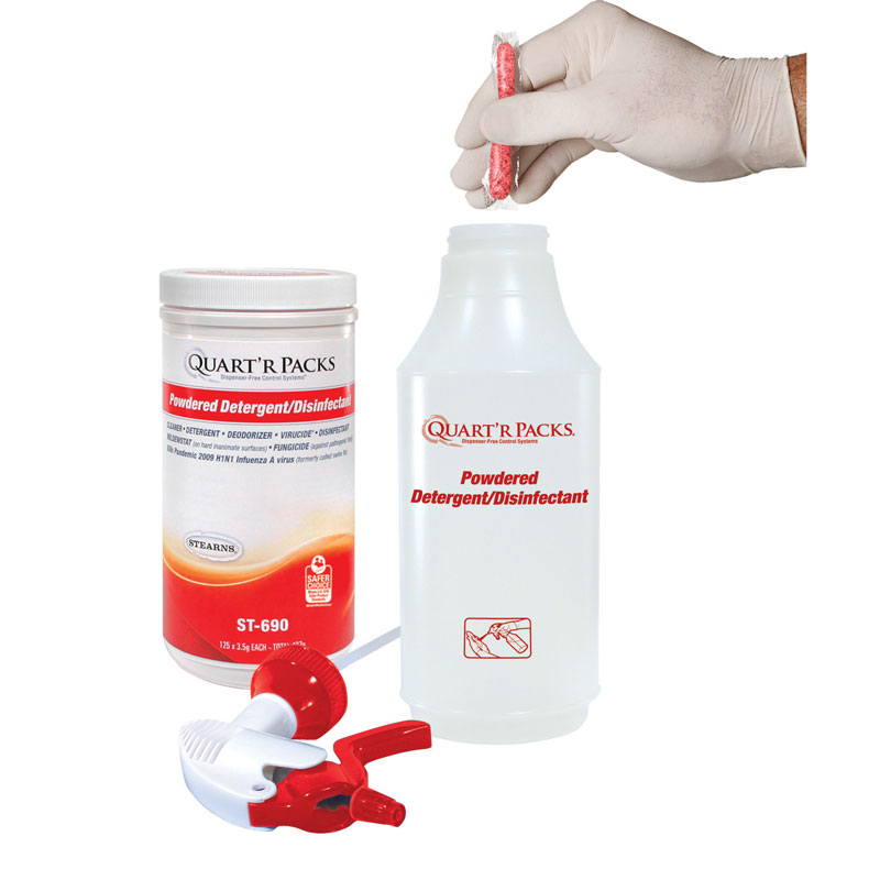 Some cleaning products are delivered and stored more efficiently as powders instead of liquids. To complement the innovative One Packs™ premeasured systems for liquids, Stearns has developed the revolutionary Quart'r Packs® water-soluble packets for powder concentrates.