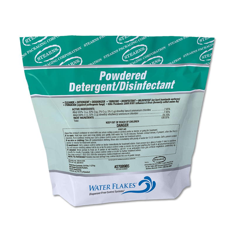 Some cleaning products are delivered and stored more efficiently as powders instead of liquids. To complement the innovative One Packs™ premeasured systems for liquids, Stearns has developed the revolutionary Water Flakes® water-soluble packets for powder concentrates.