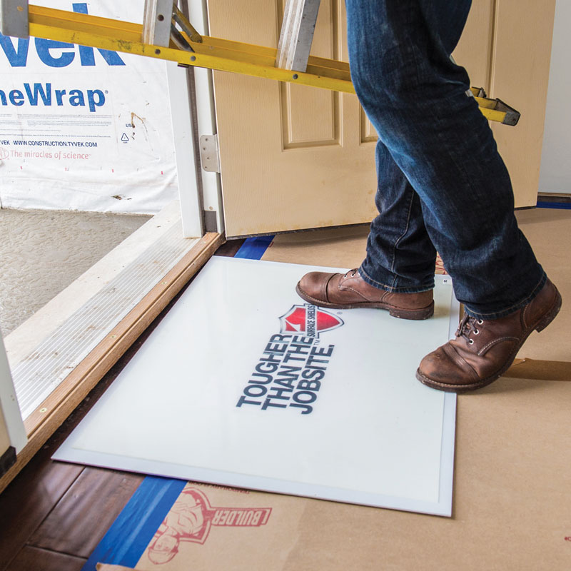 Tacky surface mat for removing dust from footwear. 30 Individually tabbed sheets for easy removal of used sheet. Sturdy, reusable, portable board for any surface has nonslip backing. Size: 25.5" x 31.5" white frame.