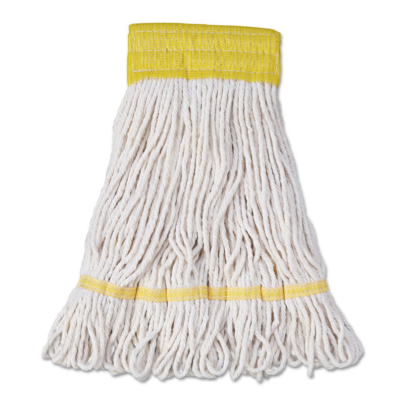 For high-volume usage. Blend of premium four-ply cotton/synthetic yarn covers more floor area by absorbing up to seven times its own weight. Looped ends reduce unraveling and linting. Durable double-sewn tailbands. Heavy-duty, 5" vinyl mesh headbands. Launderable in a mesh bag. Use with clamp or gripper style mop handles (sold separately). 12 mop heads per case.