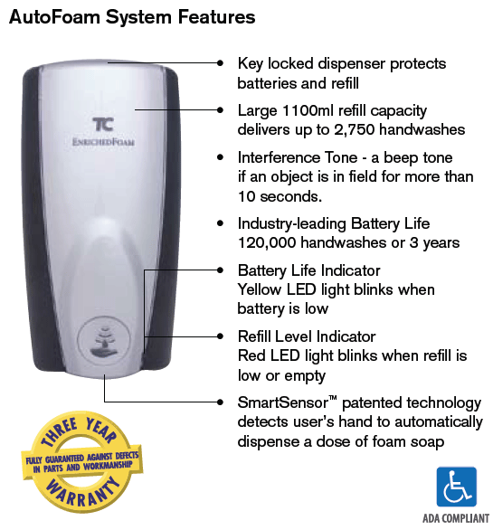 Patented Smart Sensor and Dry Cam Gear technology in AutoFoam deliver a concentrated dose of enriched foam to provide the most hand washes - up to 38% more than similar foam systems. Energy efficient technology ensures an industry-leading battery life of 120,000 doses or 3 years.