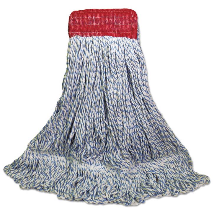 Designed for finish applications and high-volume usage. HyGrade four-ply blend, with blue stripe, absorbs moisture well and dries faster. Looped ends reduce unraveling and linting. Durable double-sewn tailband. Heavy-duty polyester tape 1 1/4" headband. Resistant to mildew and bacterial growth. Use with clamp- or grip-style mop handles (sold separately).