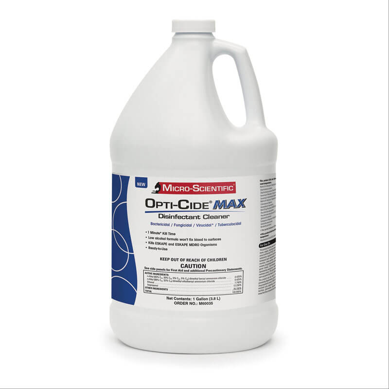 This Opti-Cide Max Disinfectant Cleaner is a fast broad spectrum, compatible with surfaces and an excellent cleaner. This Hospital-grade disinfectant is safe on clinical surfaces such as acrylic, aluminum, brass, copper, steel and chrome and for use in hospital environments, child care facilities and doctors' offices and surgery centers. It has better cleaning ability than high alcohol formulas meaning it won't affix blood and soil to surfaces. his cleaner kills most organisms in 30 seconds to one minute. The low alcohol formula (20%) won't cloud plastics. Its powerful scrubbing ability quickly, effectively and safely cleans surfaces. In only one minute, kills Eskape and Eskape MDRO organisms which are responsible for approximately 2/3 of all hospital acquired infections. Ready to use, no mixing required.