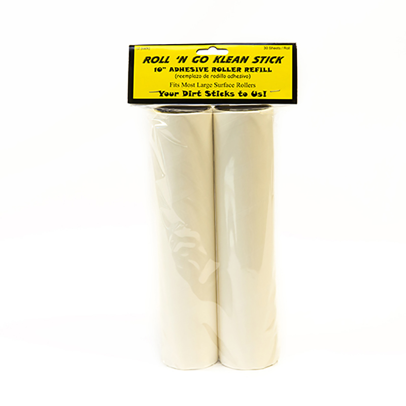 Your Dirt Sticks to Us! Universal size that fits most large surface rollers. Each 10″ wide roll contains 30 adhesive sheets. 2 rolls per pack, 6 packs per case, 12 refills rolls total. Replacement refill for Roll ‘N Go Klean Stick part # RNG-Stick.