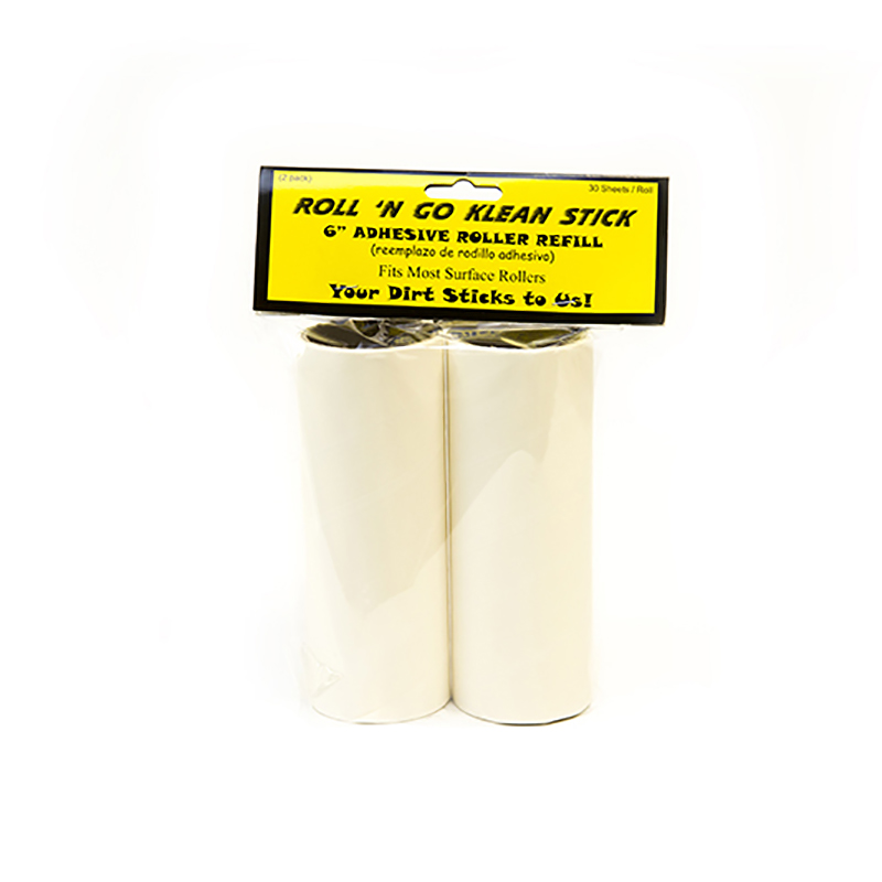 Your Dirt Sticks to Us! Quickly pick up Lint, Dust, Dirt, and Pet Hair from any surface. These smaller sized rolls are great for those hard to reach areas. Each 6″ wide roll contains 30 adhesive sheets. 2 rolls per pack, 6 packs per case, 12 refills rolls total. Replacement refill for Roll ‘N Go Klean Stick part # RNG-Stick.