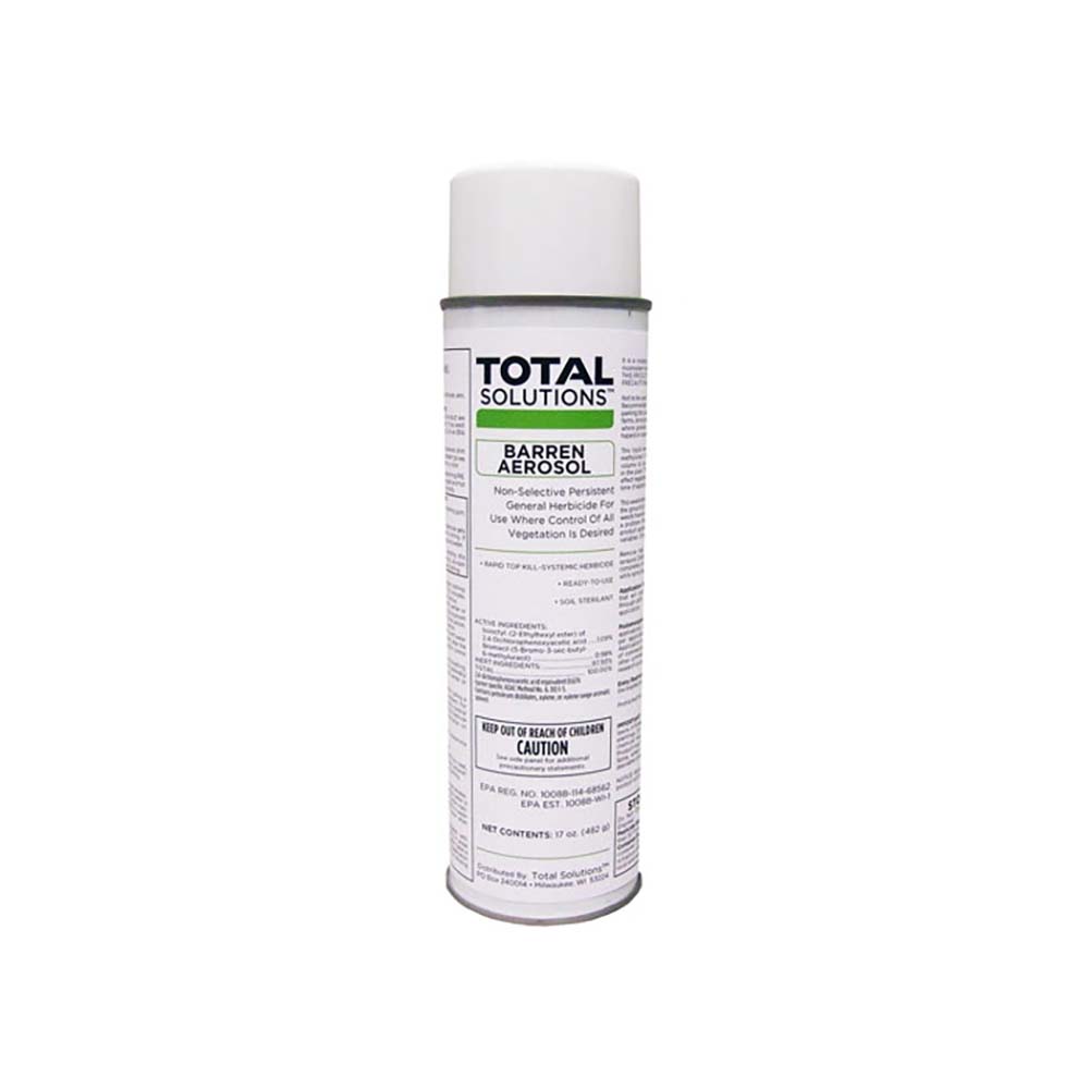 Barren Aerosol is a powerful non-selective total-kill herbicide with residual. It contains 1.09% 2,4-D and .98% Bromacil for fast top kill and long lasting residual up to 12 months. Inverted trigger ensures accurate application. Ideal for use on cracks and crevices. VOC compliant.