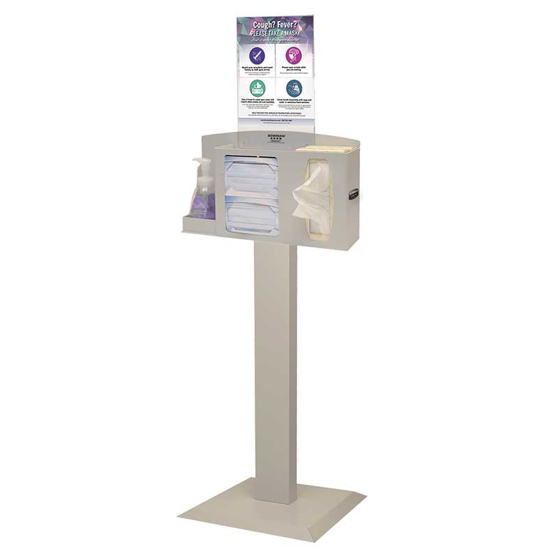 - Holds two boxes of face masks, one - two boxes of facial tissues or one box of gloves, and one hand sanitizer bottle or hand sanitizing wipe canister