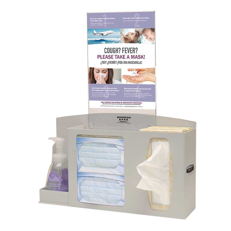 - Holds two boxes of face masks, one - two boxes of facial tissues or one box of gloves, and one hand sanitizer bottle or hand sanitizing wipe canister