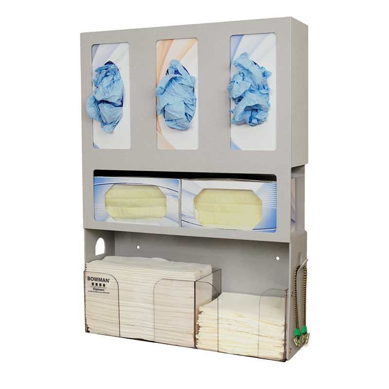 - Holds three boxes of gloves, two boxes of face masks, quarter fold towels, and patient bibs