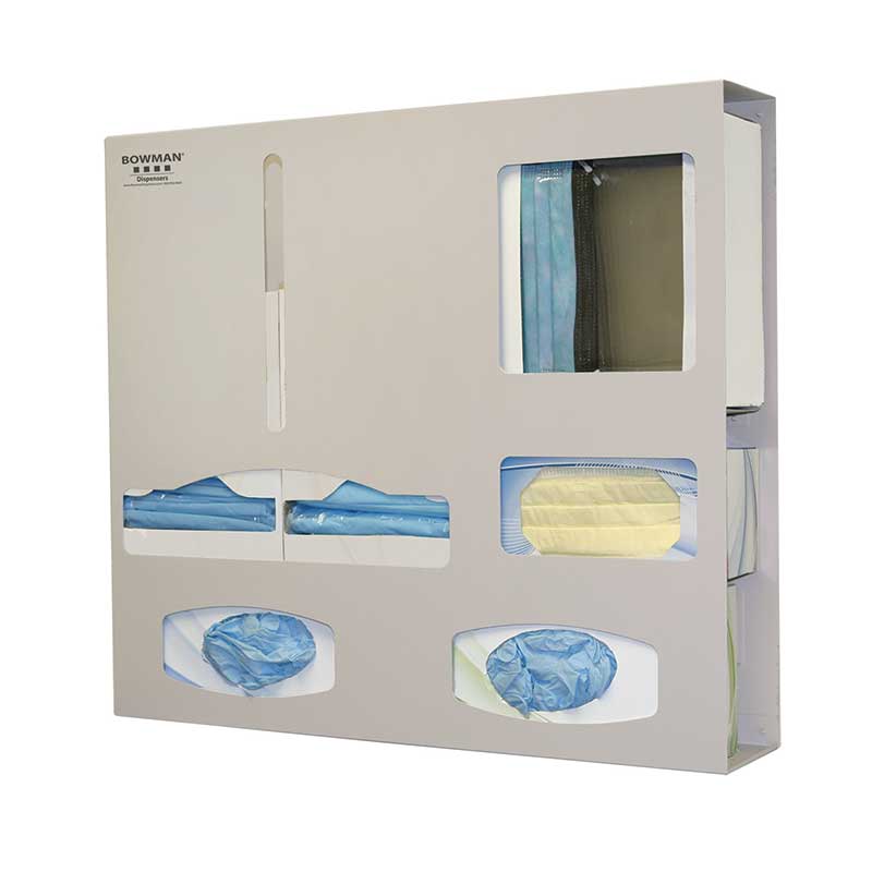 - Holds gowns, aprons, or overalls/jumpsuits, two boxes of gloves, one box of earloop masks, and one box of shield masks