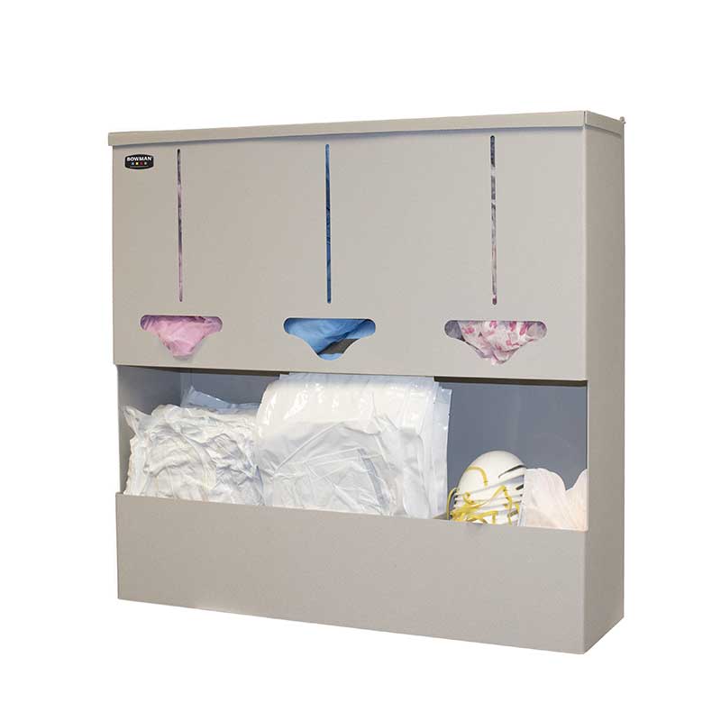 - Holds protective equipment or miscellaneous items in three bulk compartments and disposable or reusable gowns, aprons, or coveralls/jumpsuits and boxes or bulk face masks in two storage areas