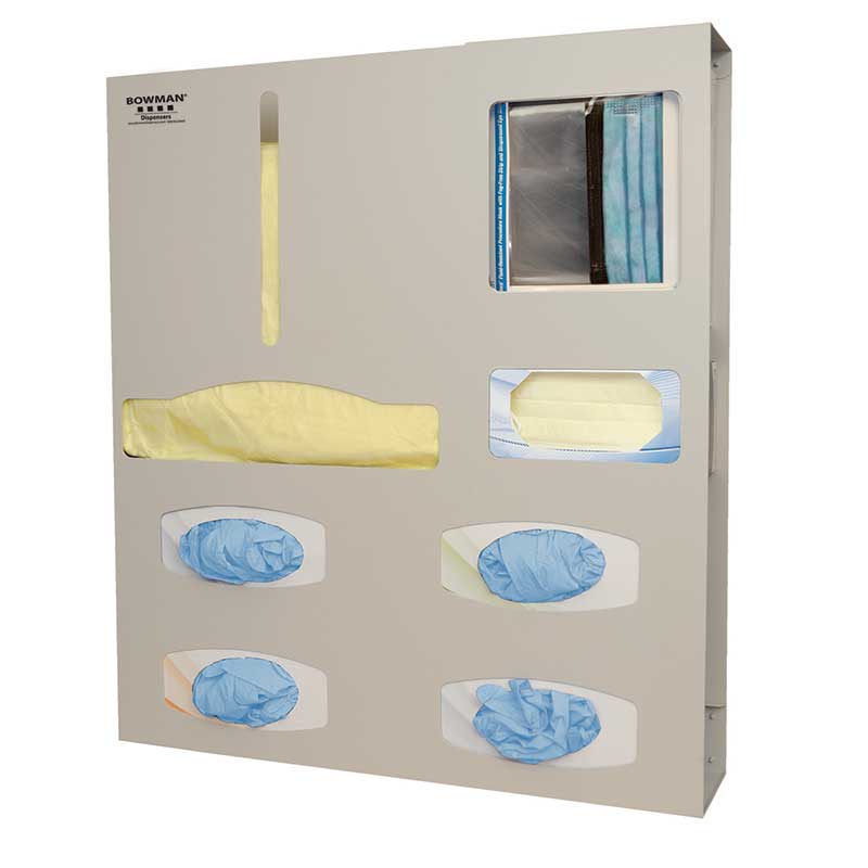 - Holds disposable or reuseable gowns, aprons, or coveralls/ jumpsuits, four boxes of gloves, one box of earloop masks, and