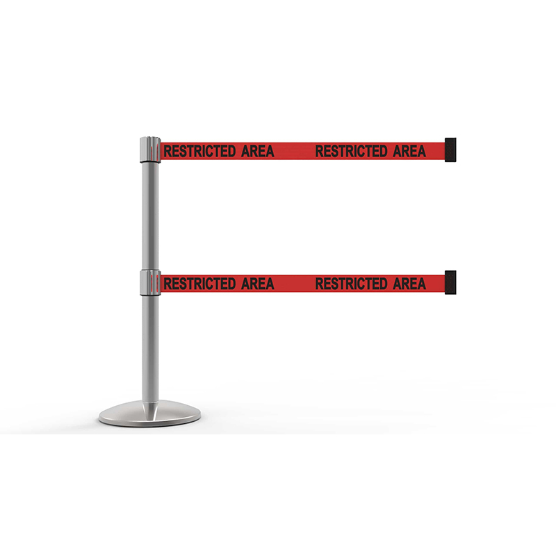 QLine Retractable Dual Belt Barrier, Polished Chrome Post, Red "Restricted Area"