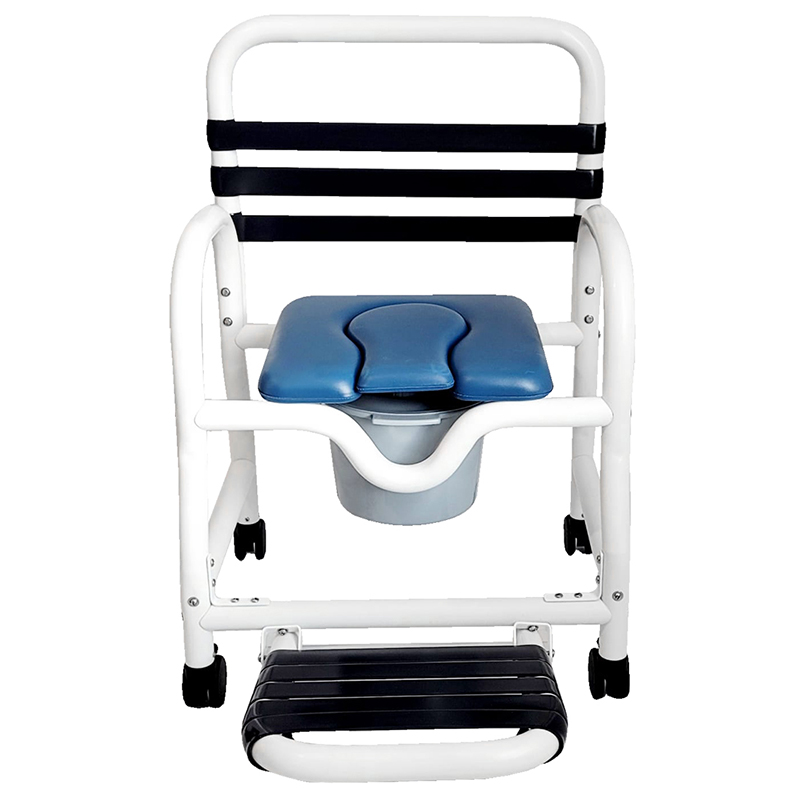 Introducing the Deluxe New Era Patented Infection Control Hygienic Access Shower Commode Chair, where comfort and hygiene meet innovation. With an expansive 22" internal width and an open front removable soft seat, this chair ensures exceptional comfort and accessibility for users of all sizes. Simplify your bathing routine with the included commode pail, offering convenient waste management. Experience added relaxation with the soft-touch folding footrest, providing support and comfort throughout your shower. Maneuver effortlessly with the 3" twin all-locking casters, ensuring stability and mobility in any bathroom setting.