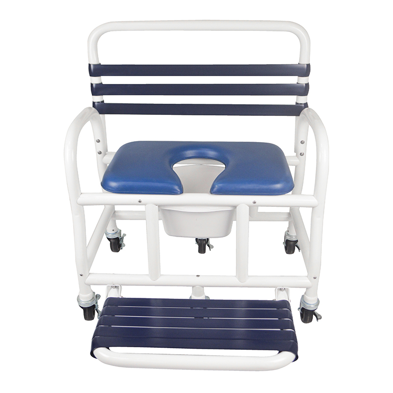 Introducing the epitome of comfort and functionality: the Deluxe New Era Patented Infection Control Shower Commode Chair. Boasting an expansive 30" internal width and an open front removable soft seat, this chair ensures unmatched comfort and accessibility for users of all sizes. Enjoy added relaxation with the soft-touch folding footrest, providing support and comfort throughout your bathing routine. The included commode pail simplifies waste management, while the 4" twin all-locking casters offer stability and mobility in any bathroom setting.
