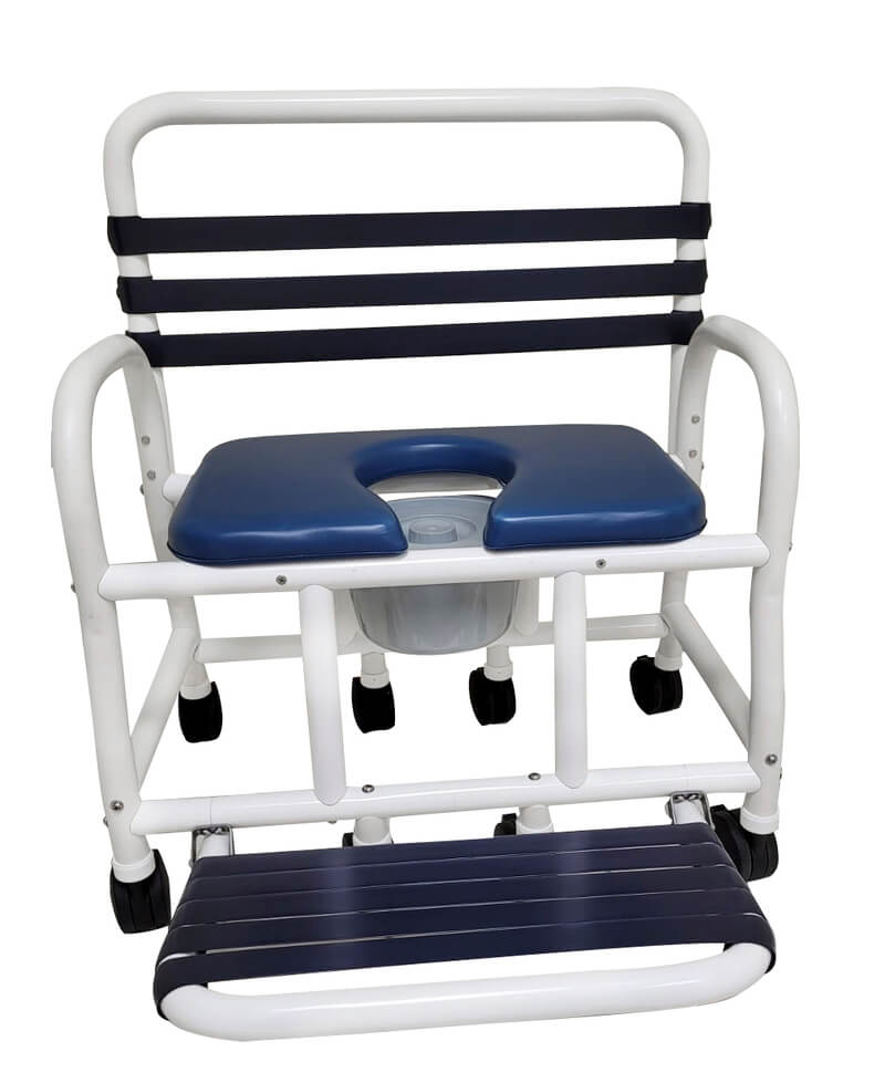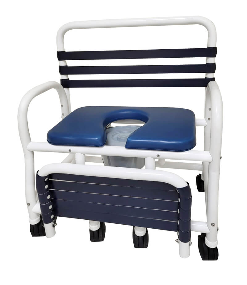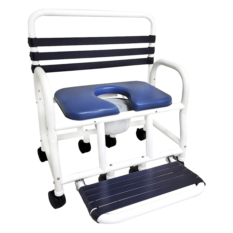 Introducing the Deluxe New Era Patented Infection Control Shower Commode Chair, where comfort and reliability are paramount. With an expansive 30" internal width and an open front removable soft seat, this chair ensures unparalleled comfort and accessibility for users of all sizes. Experience ultimate relaxation with the soft-touch folding footrest, providing support and comfort during your bathing routine. The included commode pail simplifies waste management, while the 4" twin all-locking casters offer stability and mobility in any bathroom setting.