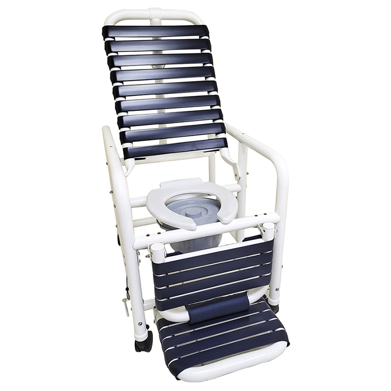 Introducing the Deluxe New Era Patented Infection Control Reclining Shower Chair, a pinnacle of comfort and functionality in the bathroom. Crafted with a generous 20" internal width and an open front hard seat, this chair ensures durability and accessibility for users of all sizes. Experience ultimate relaxation with the soft-touch footrest and elevated legrest, providing optimal support during your shower. The included commode pail streamlines waste management, enhancing your bathing experience.