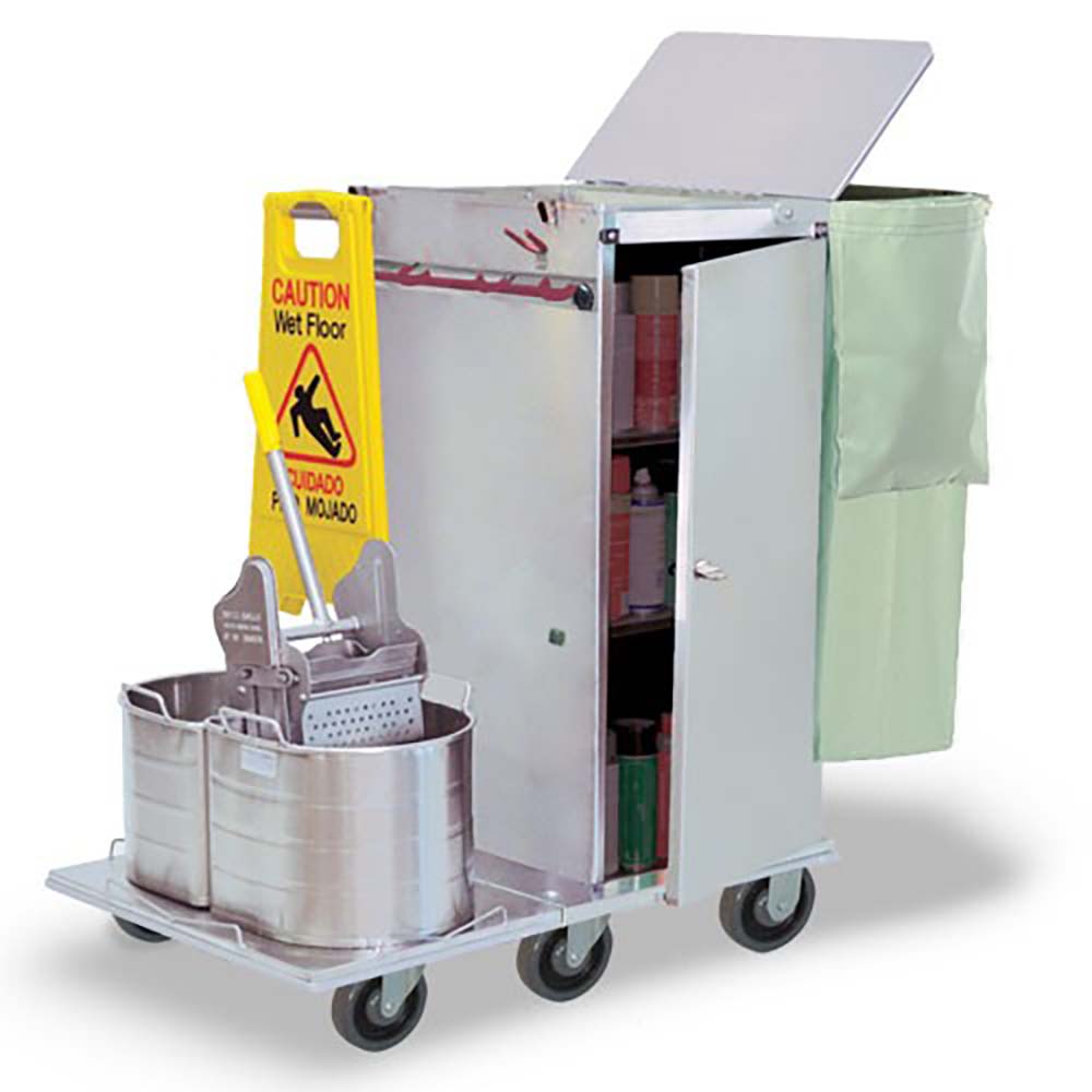 Constructed from heavy-duty commercial-grade materials, the cart is built to withstand demanding environments such as healthcare facilities, hospitality operations, and industrial sites. The enclosed cabinet provides organized storage for cleaning supplies, while integrated tool holders allow easy access to mops and brooms.