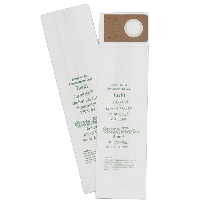 Keep your commercial vacuums performing at peak efficiency with Green Klean™ Replacement Vacuum Bags — Case of 100 (10 packs × 10). These bags are specifically engineered to fit the TASKI® Jet 38/50, Tapiset 38/45 and Tapitronic upright vacuums, providing a precise fit and excellent dust capture performance. Each bag is manufactured with high-quality micro-plus filter media that helps remove fine dust and dirt while reducing airborne particles — helping indoor spaces stay cleaner and helping maintain motor efficiency and suction life.