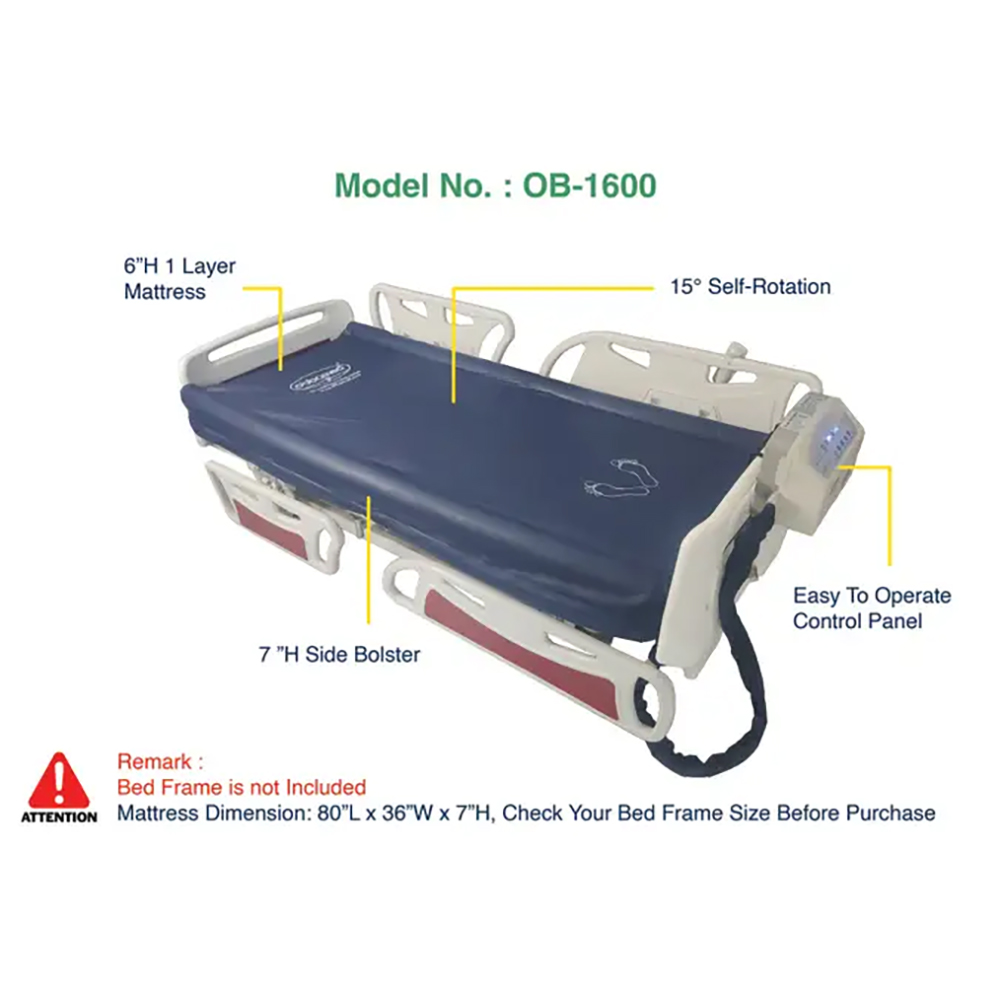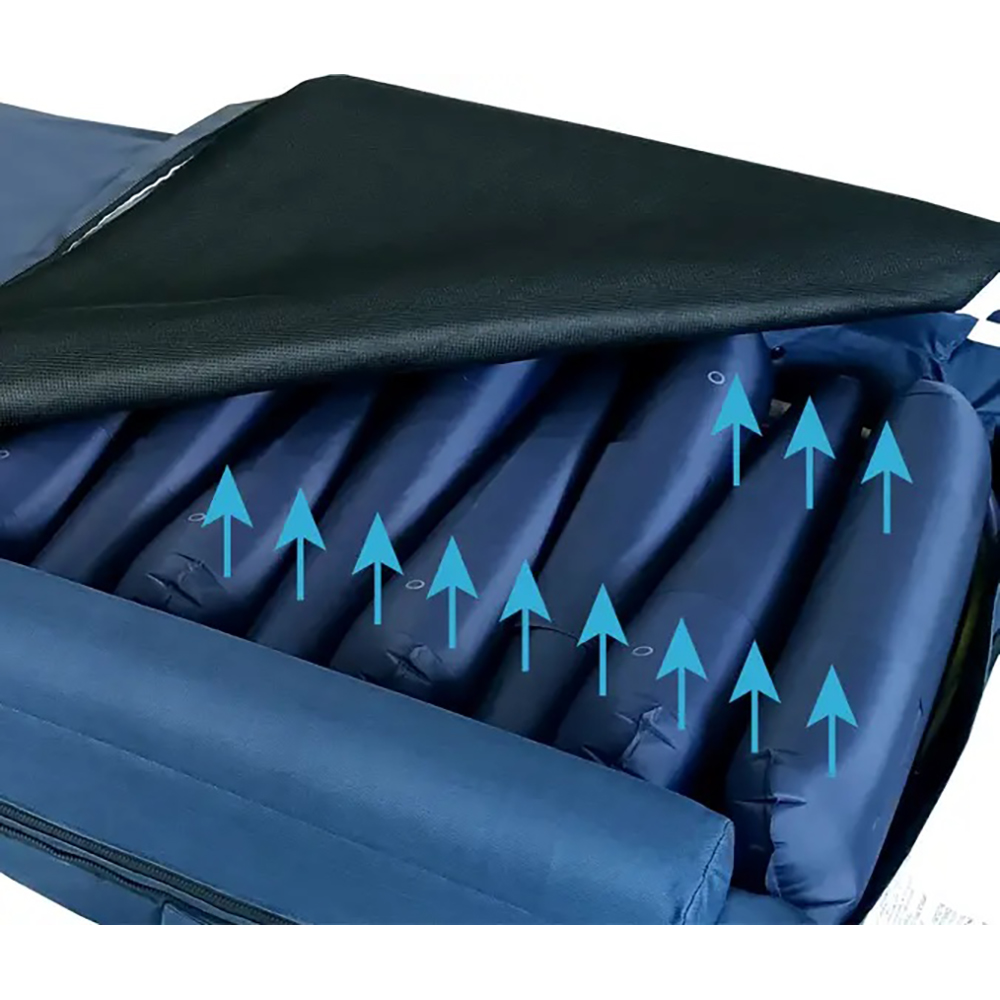 The UtilityAir LAL Alternating Pressure Ulcer Mattress provides advanced pressure ulcer prevention with 15° self-lateral rotation. Using alternating air cells that inflate and deflate in a wave-like motion, it redistributes body weight to relieve pressure points, enhance blood circulation, and prevent bedsores. The integrated Comfort-Focused Low Air Loss (LAL) system delivers with a built-in fan, maintaining a cool, dry, and comfortable microclimate. The sinking feature and raised side bolsters ensure patient safety and proper positioning. Designed for extended bed rest, it includes Fowler and seating support to reduce pressure during upright positions. Its premium antimicrobial, biocompatible, and machine-washable PU cover meets US fire safety standards for long-term durability and hygiene.