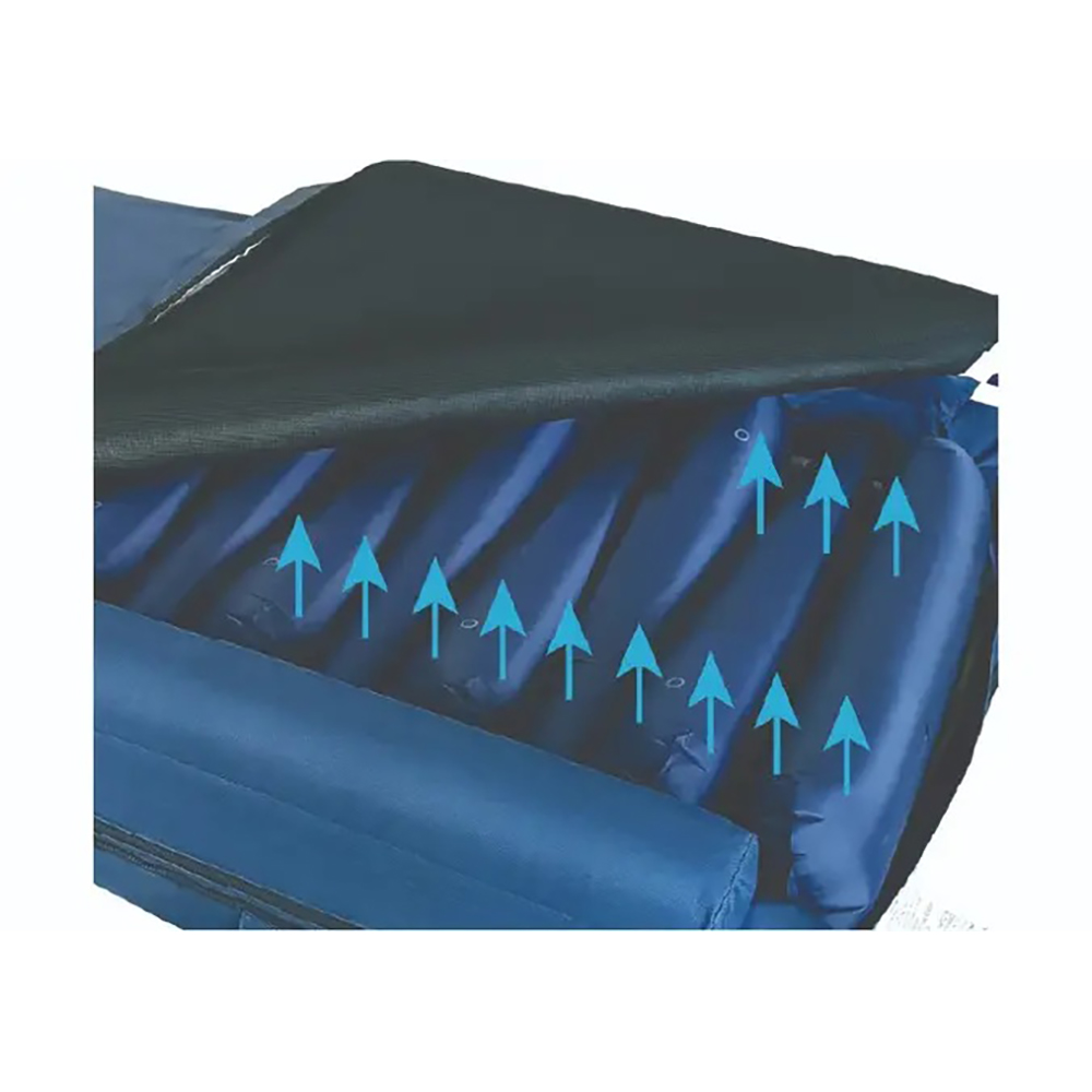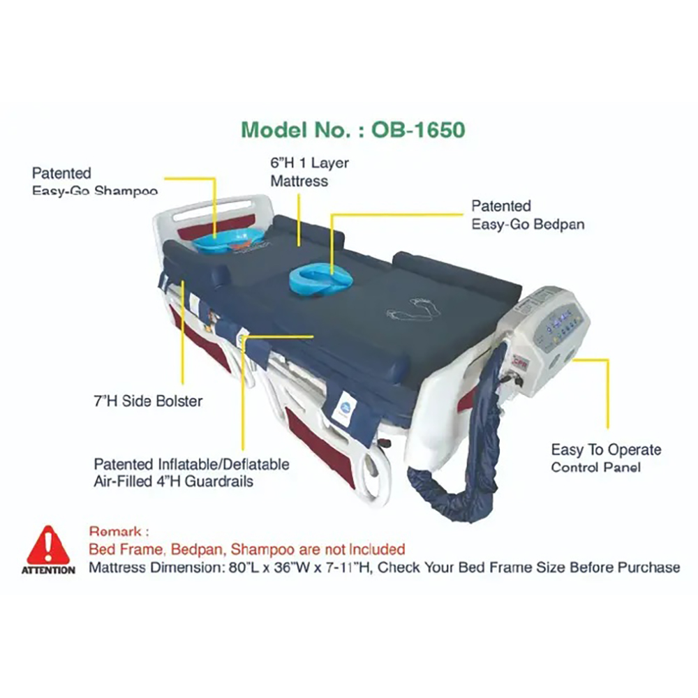 The Standard Air Mattress offers comfort, safety, and convenience for patients requiring extended bed rest. Its patented manual "Easy Go" Bedpan and Shampoo functions allow in-bed toileting and hair washing through simple one-touch controls minimizing movement, discomfort, and caregiver strain. The inflatable air-filled guardrails provide soft, secure protection, while the 15° self-lateral rotation and sinking design promote even pressure distribution, improved circulation, and effective bedsore prevention. With adjustable rotation angles up to 25°, the system supports respiratory health and mobility. The Comfort-Focused Low Air Loss (15 LPM) ventilation maintains a dry and cool microclimate, enhancing skin protection. Combined with Fowler seating support and an antimicrobial, fireproof PU cover, this mattress delivers a complete care solution for hospitals, nursing homes, and home use ensuring hygiene, comfort, and safety for every patient.