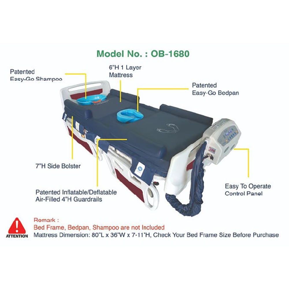 The Standard Air Mattress combines innovation and comfort to deliver advanced care for bedridden patients. Its patented "Easy Go" bedpan and shampoo functions enable hygienic in-bed toileting and hair washing at the touch of a button, reducing strain for caregivers and enhancing patient dignity. Inflatable air-filled guardrails offer safety without discomfort, while the self-lateral rotation and sinking centralization features promote circulation, reduce pressure sores, and maintain proper positioning.