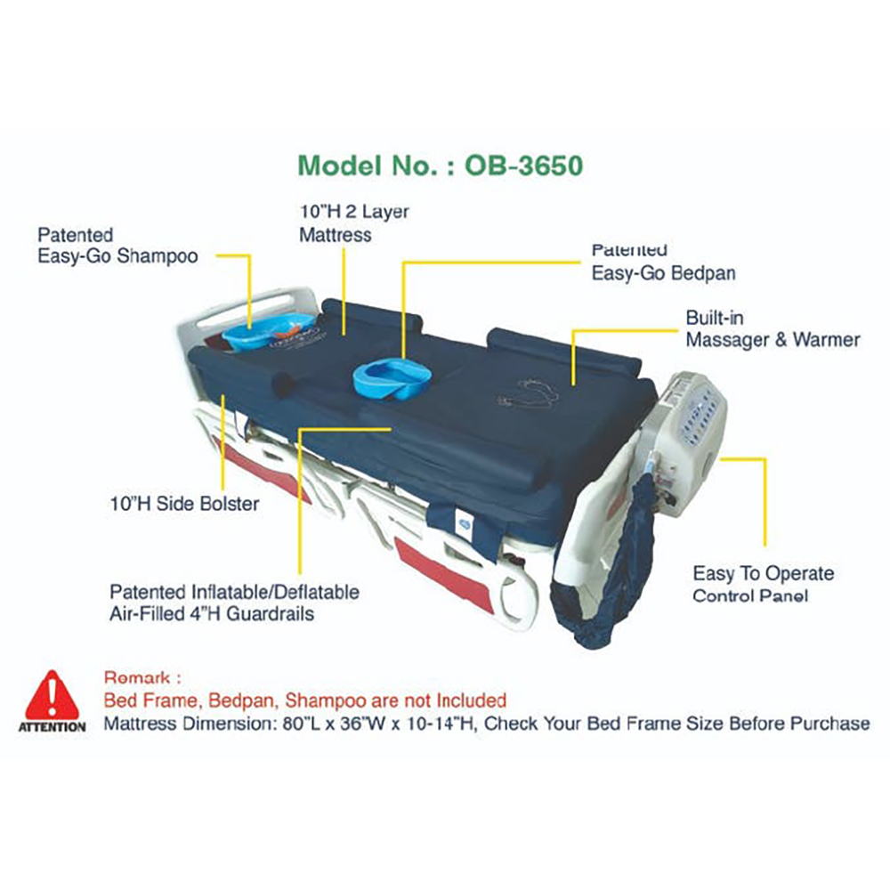 The Ultra Air Mattress is a premium therapeutic system engineered for advanced patient care and maximum comfort. Featuring patented "Easy Go" bedpan and shampoo functions, it enables hygienic in-bed toileting and hair washing with a single touch. Its inflatable air-filled guardrails, self-lateral rotation, and sinking centralization design enhance safety, circulation, and posture alignment for bedridden patients.
