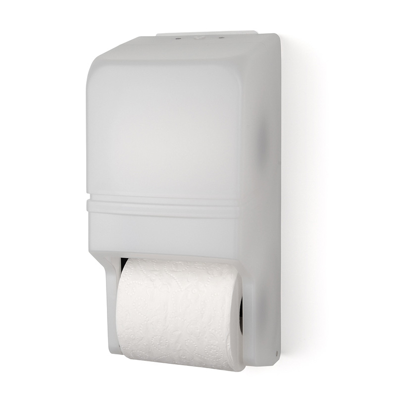 The Two Roll Standard Tissue Dispenser with a metal back is easy to use and install. The modern design is sure to compliment any decor. The dispenser uses standard toilet tissue paper up to 5″ in diameter with a 1-1/2″ core. Access to reserve roll is accessible once lower roll is completely used. Unit features a translucent cover to allow view of paper supply and a durable lock prevents theft.