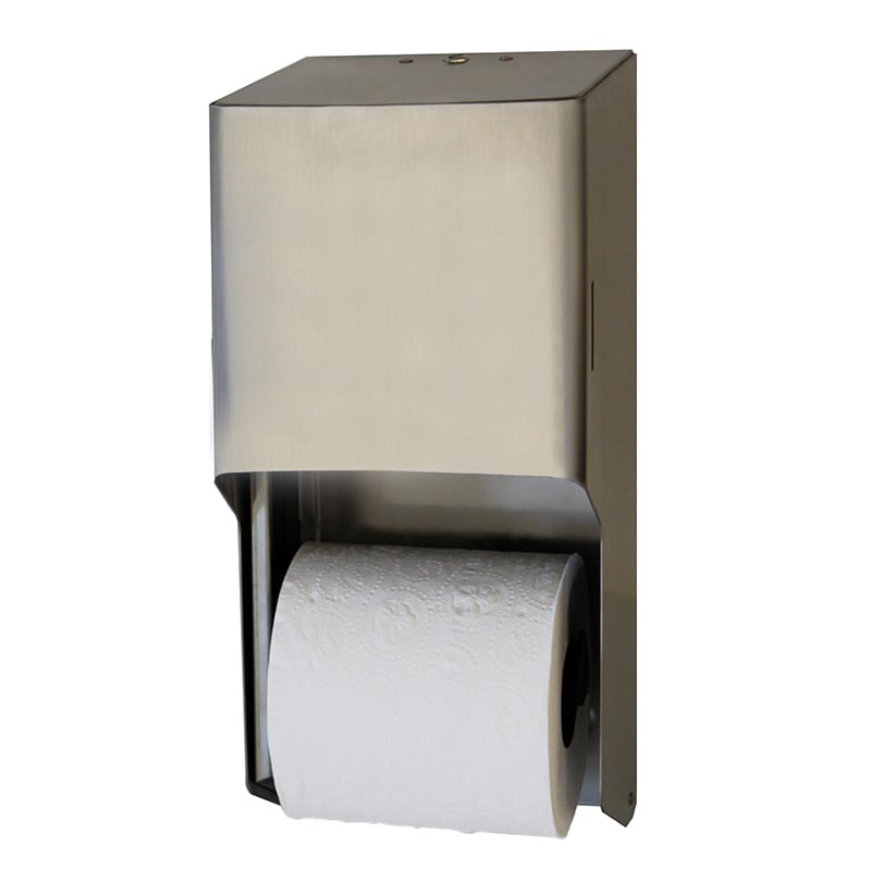 The Standard Double Roll Tissue Dispenser features a sleek stainless steel finish that will fit nicely into any restrooms decor. Fits two standard toilet tissue rolls with a minimum 1-1/2″ core. The heavy duty lock prevents theft and vandalism. Design allows user to completely use one roll before transferring to the next. Heavy gauge steel construction is designed for maximum strength and durability.