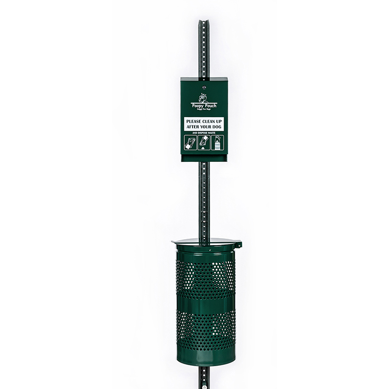 The All-In-One Solution! Maximum storage at a minimum price!! Locking header dispenser made from durable, rustproof powder coated steel construction that lasts for years! Holds up to 600 of our single pull bags that are flat packed and dispenses one-bag-at-a time for longer refill intervals! Integrated sign “Please Clean Up After Your Dog” is screen-printed directly on the dispenser. Kit includes an 8 ft. channel post (in two 4 ft. sections) and 10 gallon waste receptacle with or without lid. Mounting hardware and instructions included. Use with replacement bags part #PP-H-200-20M.