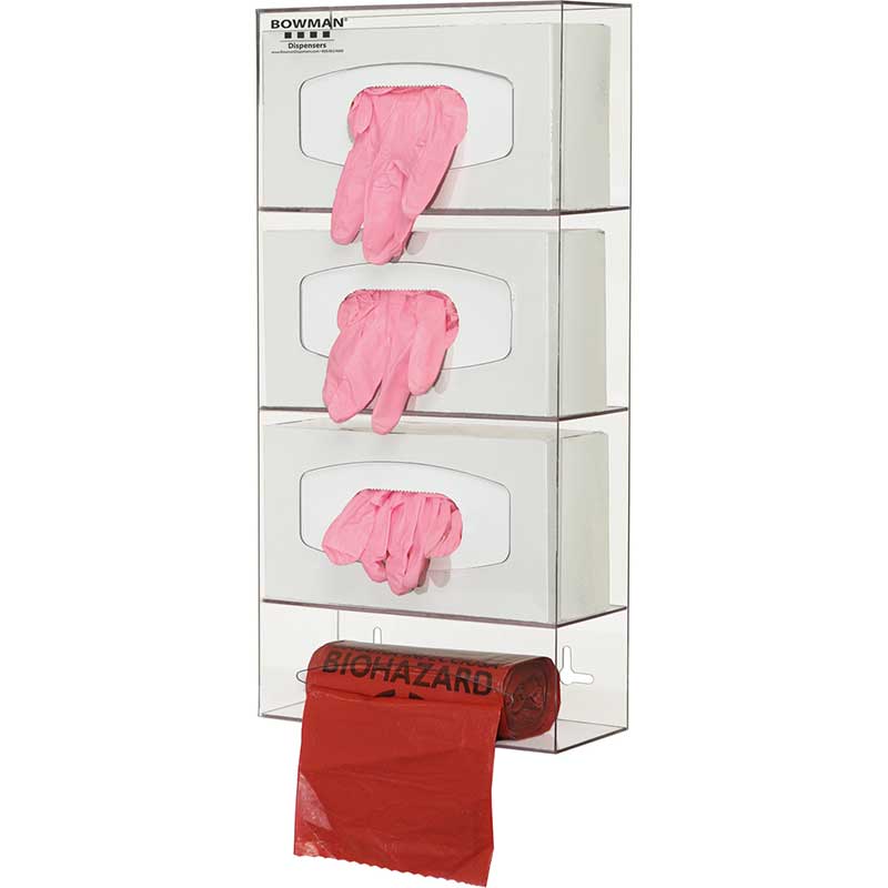 - Holds three boxes of gloves and one roll of individual-sized biohazard, linen, or garbage bags