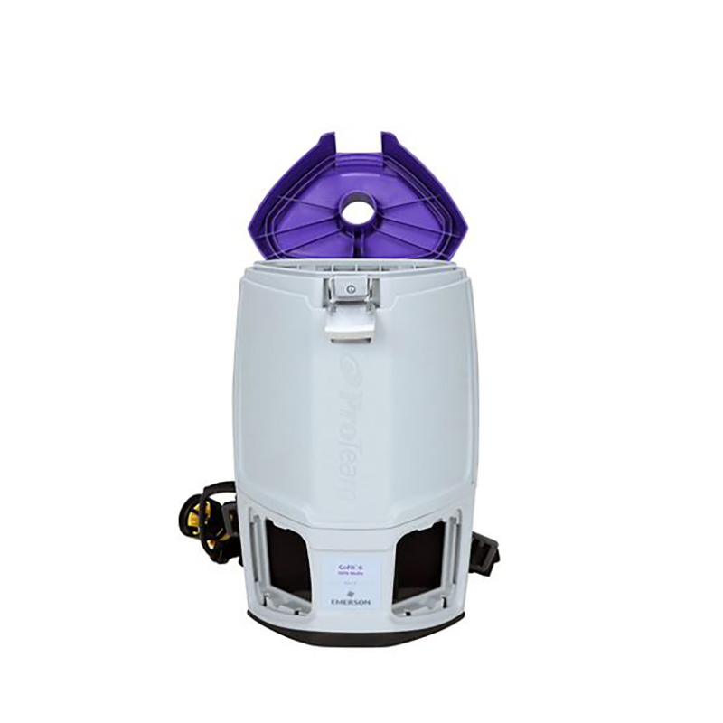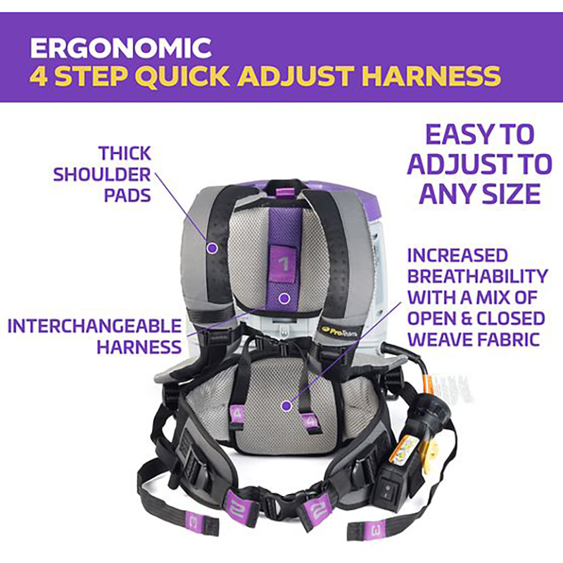 The GoFit 3 qt. backpack commercial vacuum is the most recent and smallest vacuum from ProTeam. Engineered to produce the same power and efficiency as larger versions, this 3 qt. is perfect for those with smaller frames and ideal for individuals new to wearing a backpack vacuum or maneuvering tight spaces. Since ergonomics matters, the GoFit Backpack Vacuum Series, including this 3 qt., features a 4-step FlexFit articulating harness was inspired by top-rated backpacks beloved by hikers worldwide and is designed to rest comfortably on the user's hips for hours of wear. Additionally, the FlexFit harness's purple numbered touchpoints provide a customized, quick-adjust fit, no tools required. The ProLevel Filtration System with HEPA Media, helps reduce allergens and asthma triggers found in the indoor environment and captures 99.79% at 0.3-5 microns per ASTM F3150. When it comes time to change out the filters, to ensure maximum efficiency, you'll find one hand is all you need with the newly designed hinged lid with a single, durable, quick-release, die-cast aluminum latch for easy access. Includes Xover Multi-Surface Telescoping Wand Tool Kit 107100: 14" Xover multi-surface floor tool (107016), 42"- 57" two-piece two-bend telescoping wand (107628), 17" crevice tool (100108), 3" dust brush (100110), 5" upholstery tool (100115), 2 filter bags (107666) and a 50' power cord (101678). Use filter bags open collar #107666 or closed collar #107667.