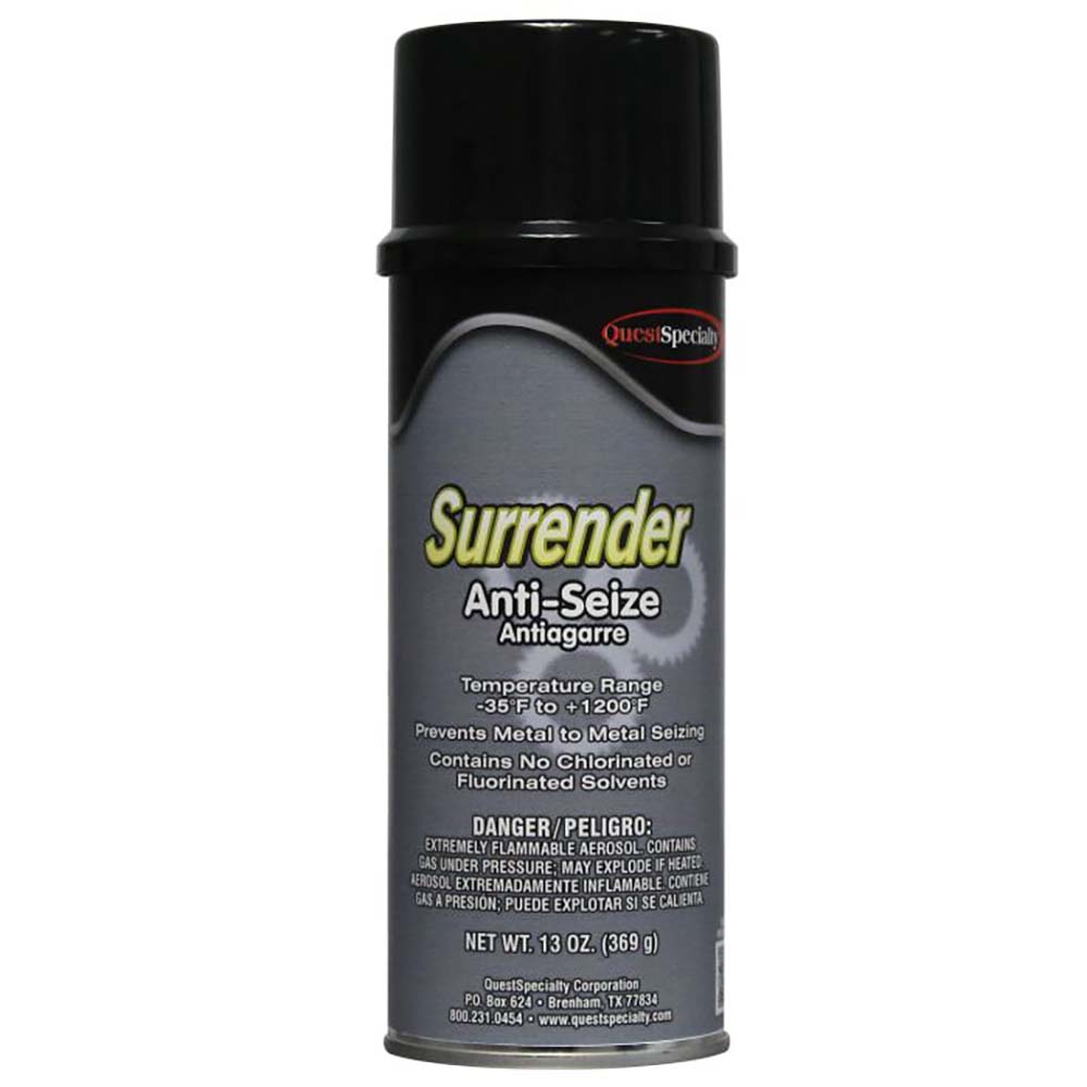 SURRENDER contains molybdenum disulfide, graphite and aluminum in a thick grease base. It helps eliminate seizing of threaded parts and helps cool hot bearings. It does not contain any chlorinated or fluorinated solvents and has a temperature range from -35 deg F to 2200 deg F.
