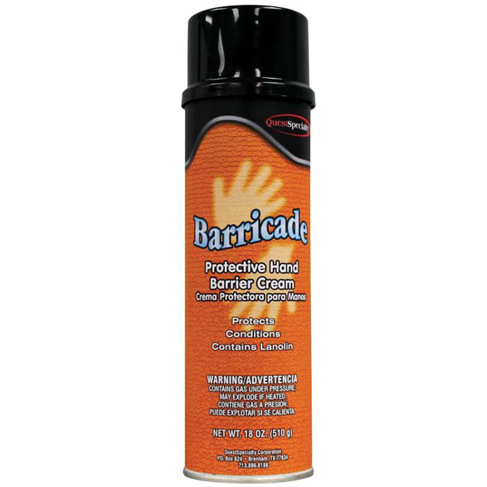 BARRICADE is a water-based, ready-to-use protective skin coating in convenient aerosol form. It protects exposed areas of skin from irritation when working with acids, alkalis, solvents, gasoline and other chemicals, and corrosive salts by forming a barrier to prevent grease, soil and ink from penetrating the skin's pores and creases.