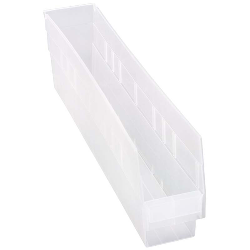 Maximize your storage space with durable, high density tri-clear polypropylene bins. Quantum's STORE-MORE 6"H Shelf Bins are the industry standard for quality. These bins feature a molded-in label holder, built-in rear hang-lock which allows bins to tilt out for complete access when on shelving. A wide hopper front allows complete access to the contents of the bin. Edges are reinforced for added strength. The designed for shelving units, racks or standard shelving. Optional dividers are a perfect solution to create a par level system. Bins are waterproof and corrosion-free.